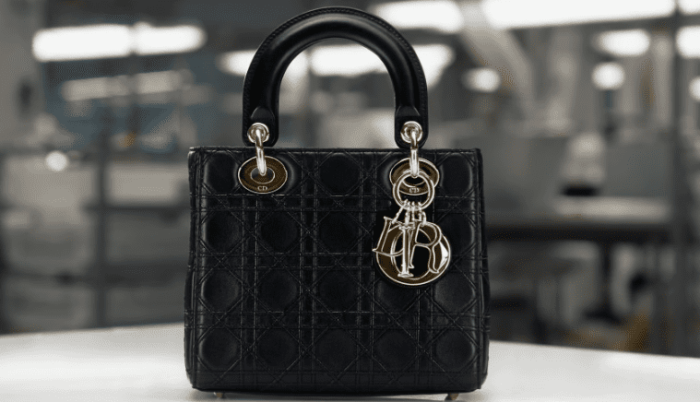 1995年為黛安娜王妃設計的「Chouchou」包,後更名Lady Dior。每個包需耗費140片皮革部件,藤格紋縫線要求每英寸12針的精度。法國工坊特有的「皮緣染色」技術,使邊緣顏色比正面深3個色階以增強立體感。