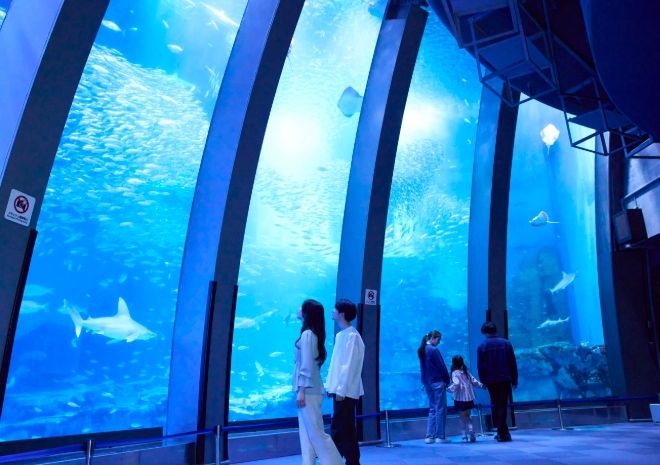 這裡有個核心魅力點:Aqua Museum水族館。它不只是大(日本最大級別之一!),設計更是充滿巧思。那個貫穿好幾層樓、高達好幾層樓的巨大水槽「Aqua Tube」,站在底下抬頭看,鯨鯊、魟魚緩緩從你頭頂遊過,那份震撼感... 真的,跟你在螢幕前看影片完全兩回事!現場看,你會不自覺屏住呼吸。每次去,我都會在那待上好久。